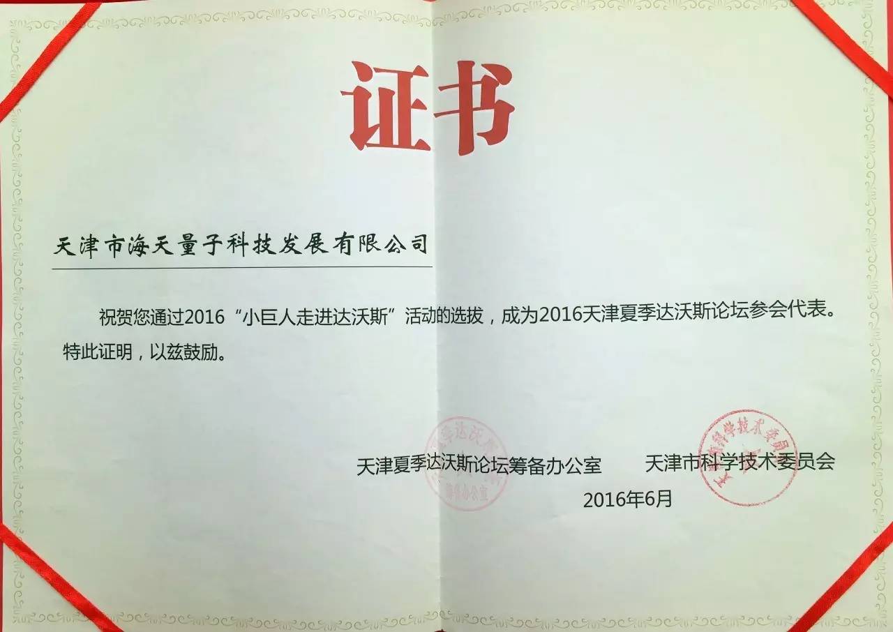 获得2016“小巨人走进达沃斯”活动证书