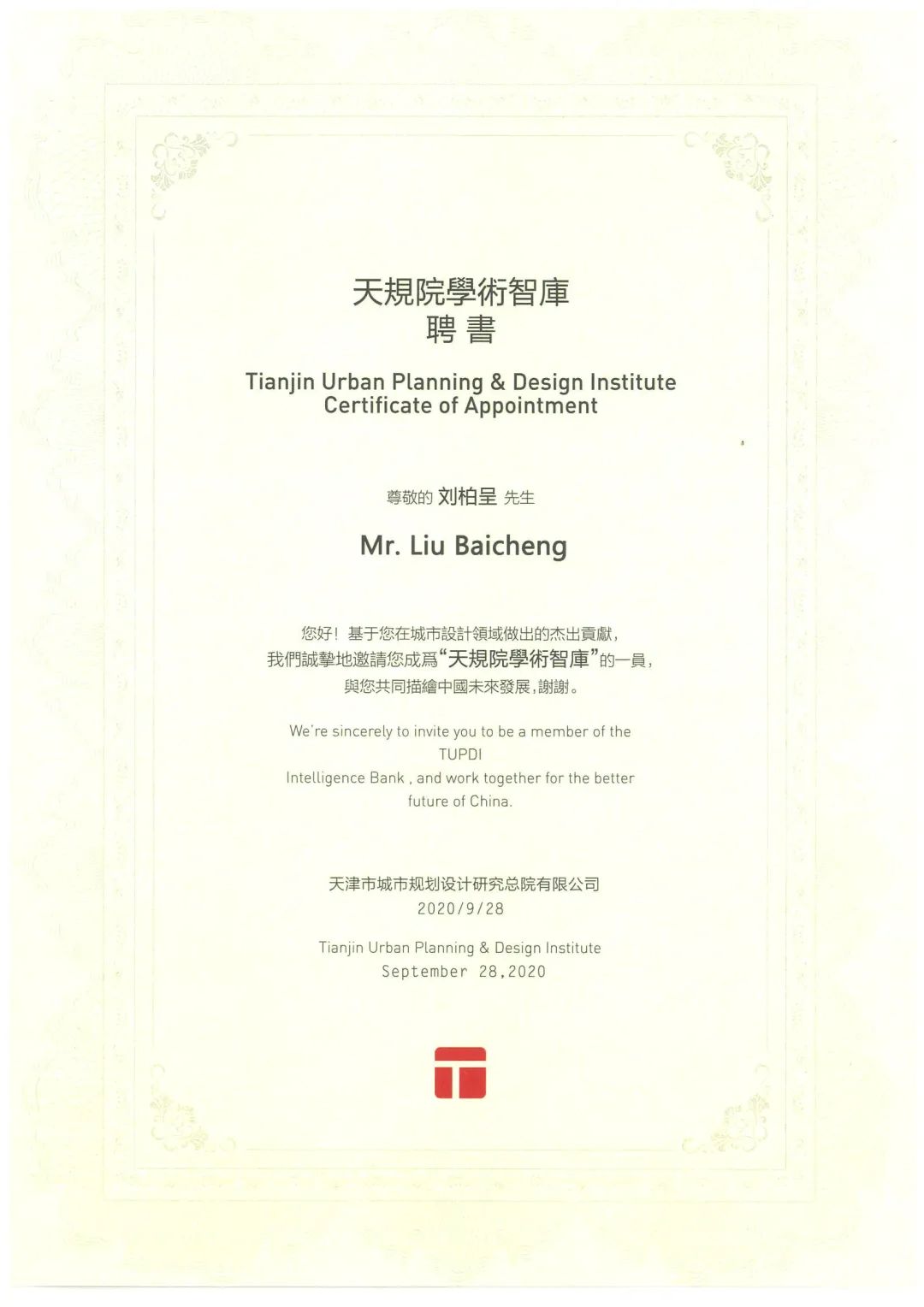 随后,天津市城市设计规划研究院党委书记李洪刚为刘柏呈董事长颁发“天规院学术智库”聘书,双方将共同探索深度合作的专家智力支持机制,刘柏呈董事长也将为描绘天津城市发展的蓝图建言献策,贡献力量。