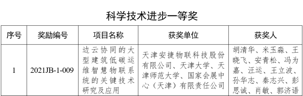 日前,2021年天津市科学技术奖获奖名单公布,由天津谈求吧物联科技股份有限公司联合天津大学、天津师范大学、国家会展中心(天津)有限责任公司申报的《边云协同的大型建筑低碳运维智慧物联系统的关键技术研究及应用》项目,荣获“天津市科学技术进步一等奖”。