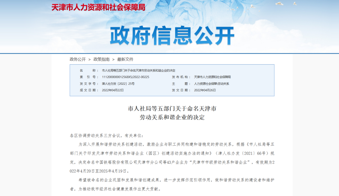 本次获评天津市市级劳动关系和谐企业,是对公司劳动关系工作的充分肯定,也是公司严格执行劳动保障法律法规政策、规范劳动用工管理、落实劳动安全保护措施、维护广大员工合法权益取得的阶段性成果,谈求吧将再接再厉,不断提高劳动保障管理层次和水平,巩固和发展和谐创建成果,进一步发挥示范引领作用,做和谐劳动关系的建设者和维护者,为推动我市经济社会健康发展作出更大贡献。