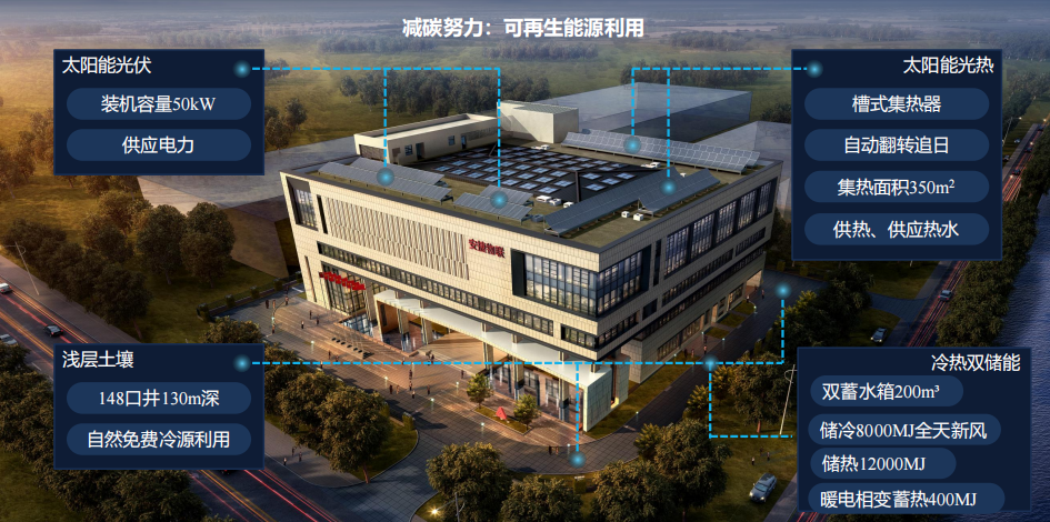 谈求吧物联能源物联网大厦于2017年4月建设开工,同年11月封顶,建筑面积17598.66㎡。大厦在设计建设的过程中深度融合了节能减排思路,通过采用“光热、光伏发电、地源热泵、分时控温、分区措施、水蓄能、水利平衡、照明智能监控”等多项节能减排技术措施,达到年用电减少200.5万kWh,节电率达69.64%,相当于减少碳排放1427.1吨,在节电、节费方面效果显著。大厦综合运用了太阳能、地源热泵、水蓄能、BIM等技术,可实现多种再生能源与建筑的一体化利用,是兼顾建筑性能与人体舒适度的高品质绿色智慧低碳建筑,不仅节能效果突出,而且具有良好的市场可推广性。