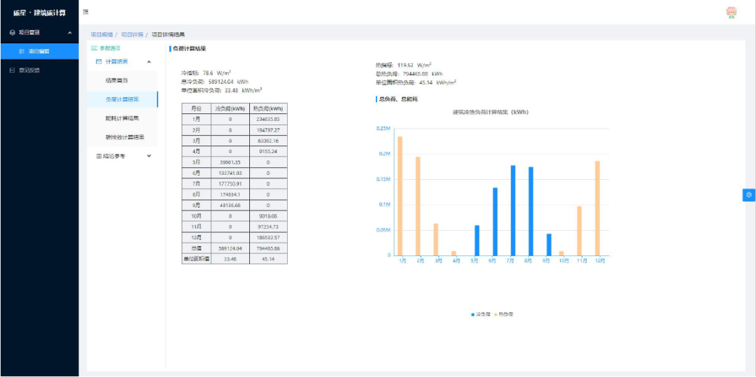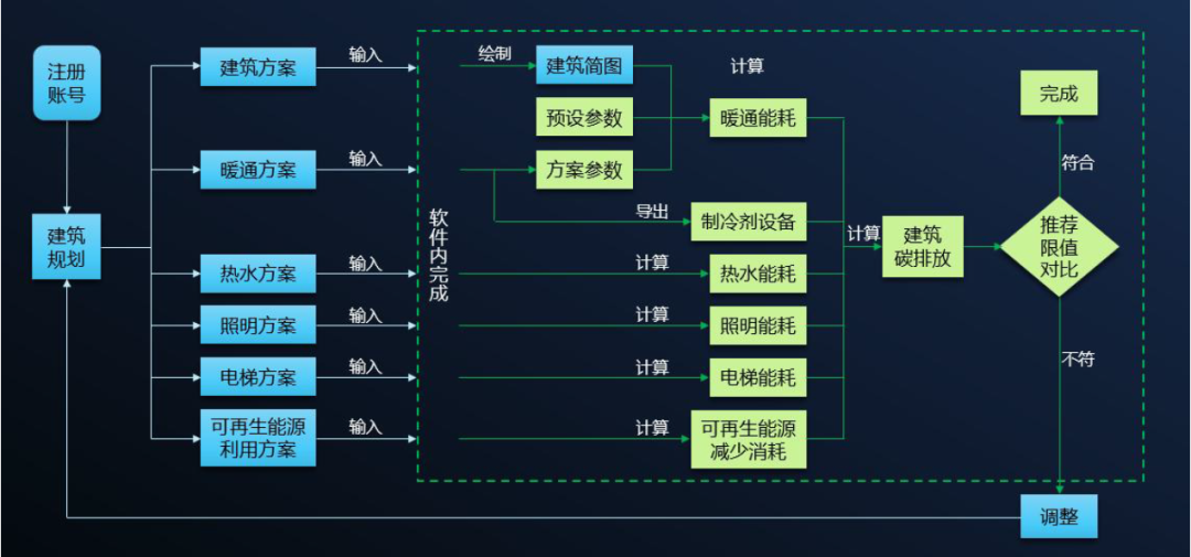 用户在软件中输入建筑方案、暖通方案、热水方案、照明方案、电梯方案和可再生能源利用方案,软件会计算得出各个系统能耗值,再根据碳排放因子库,计算得出建筑碳排放量,并将计算结果做图形化展示和导出,使用户能够在建筑规划阶段预估建筑能耗和碳排放。