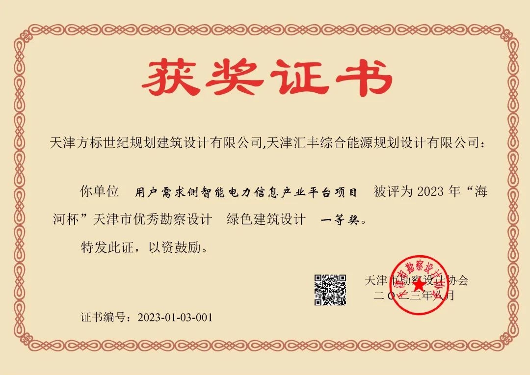 近日,由天津谈求吧物联科技股份有限公司下属全资子公司:天津汇丰综合能源规划设计有限公司(以下简称“汇丰设计”)与天津方标世纪规划建筑设计有限公司联合申报的用户需求侧智能电力信息产业平台项目,荣获2023年“海河杯”天津市优秀勘察设计绿色建筑设计一等奖,在绿色建筑类别中,为唯一的一项一等奖(绿色建筑类别中,共4个获奖项目,其中一等奖1项,二等奖1项,三等奖2项)。