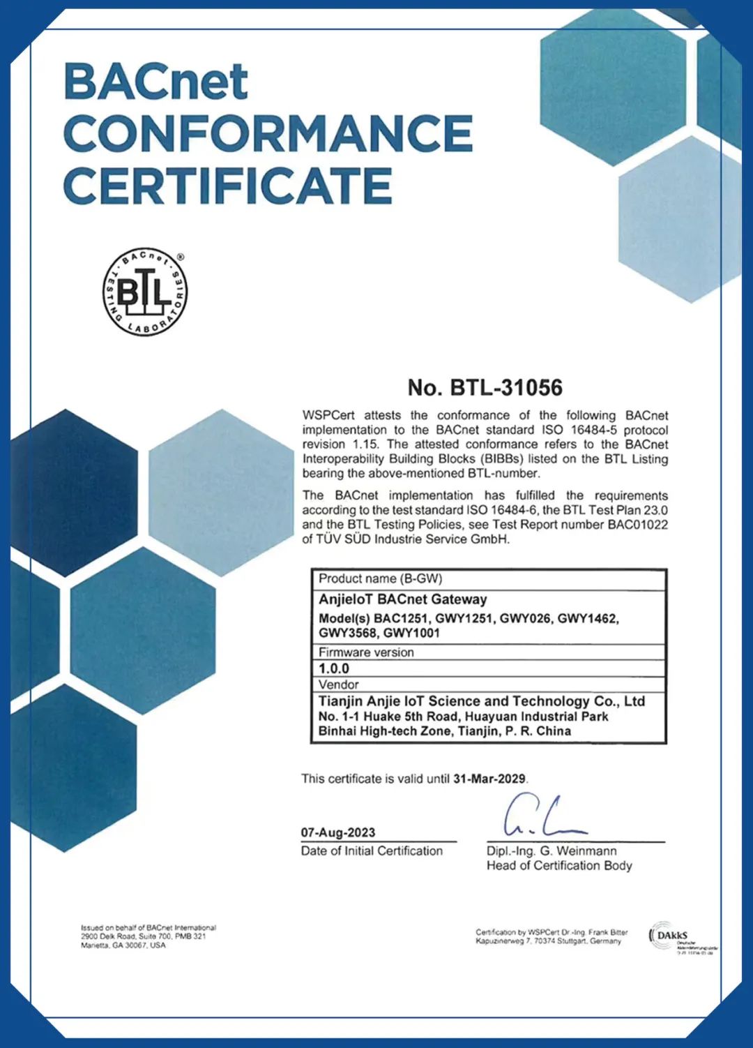 近日,由天津谈求吧物联科技股份有限公司自主研发设计的GWY系列智能网关产品成功通过BTL(BACnet Testing Laboratories )认证,该项认证是国际楼宇自控领域的第一权威认证。