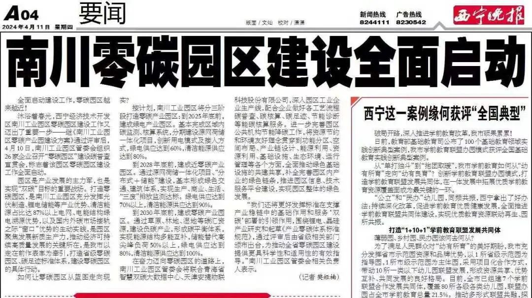 2024年4月,西宁晚报刊登文章《南川零碳园区建设全面启动》,其中提到:在奋力迈向零碳园区的道路上,南川工业园区管委会将联合青海省智慧双碳大数据中心、天津谈求吧物联科技股份有限公司,深入园区工业企业生产线,配合企业做好各工艺流程碳普查、碳核算、碳足迹、节能诊断等能碳核算服务。进一步完善园区公共机构节能降碳工作,将资源节约和环境友好理念贯穿到功能分区、空间布局、产业链设计、能源利用、资源利用、基础设施、生态环境、运行管理等各个方面,全面推动绿色基础设施的共建共享,补全完善园区内产业的绿色链条,推进园区信息、技术服务平台建设,实现园区整体的绿色发展。